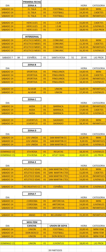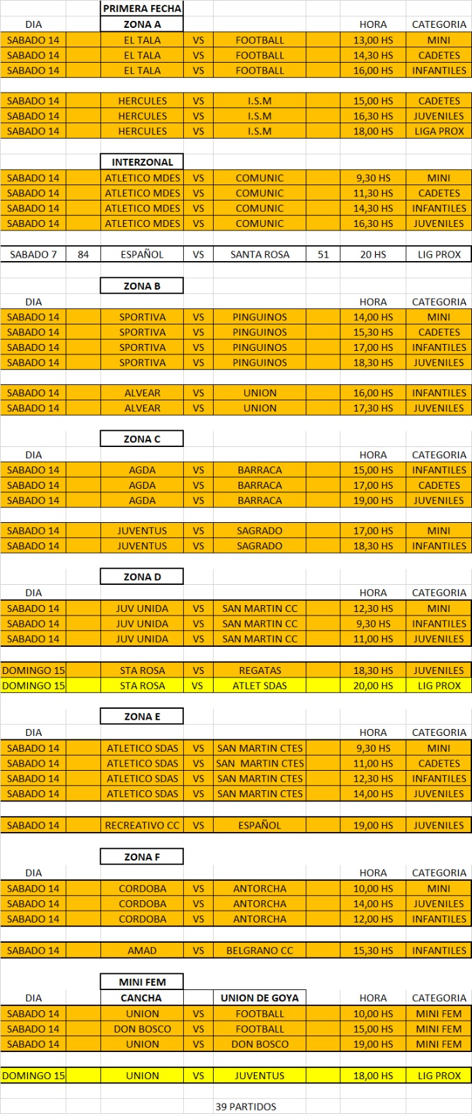 En el inicio de la competencia, por la Zona A se enfrentarán El Tala que recibirá a Football en Mini, Cadetes e Infantiles. Hércules será anfitrión de I.S.M. en Cadetes, Juveniles y Liga Próximo. Todo el esto el día sábado.
