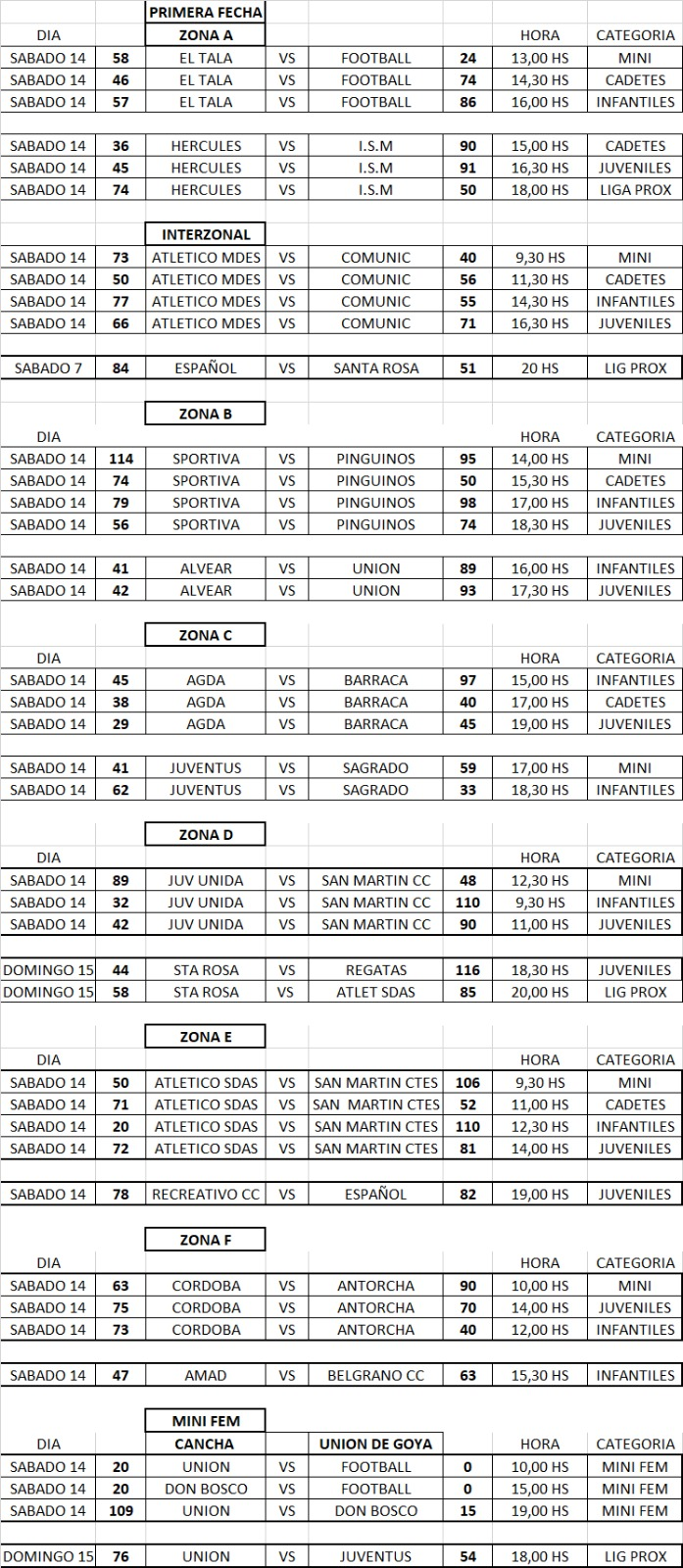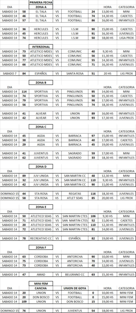 Por la zona A, Esquina Football visitó a El Tala y le ganó en las categorías Cadetes e Infantiles, mientras que el conjunto capitalino se quedó con el triunfo en el Mini. Por su parte, ISM también se quedó con dos triunfos de visitante, en Cadetes y Juveniles, frente a Hércules, mientras que el club del barrio Libertad se quedó con la victoria en el duelo de Liga Próximo.