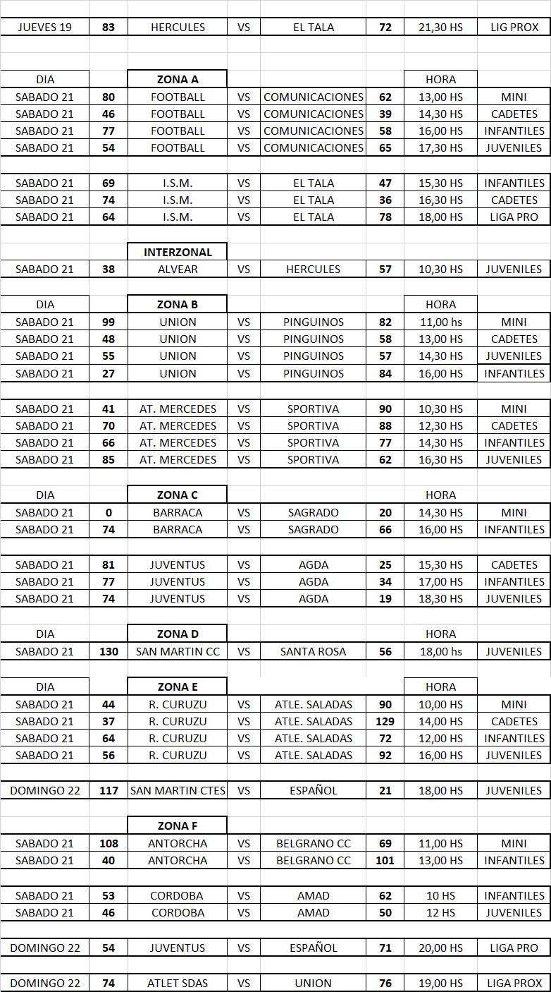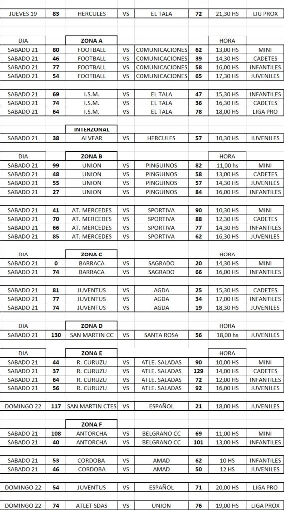 Por último, en la Zona F, Antorcha derrotó a Belgrano en Mini, mientras que en Infantiles el triunfo fue para los curuzucuateños. Como visitante, AMAD le ganó los dos duelos a Córdoba (Infantiles y Juveniles). Español venció a Juventus en Liga Próximo, mientras que por la misma categoría, Atlético Saladas fue superior a Unión. En el duelo Interzonal, Hércules le ganó como visitante a Alvear en Juveniles.