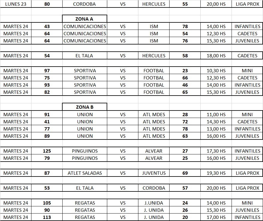 Por la Zona A, Esquina Footbal derrotó en tres de cuatro enfrentamientos a Comunicaciones (Mini, Infantiles y Cadetes), mientras que en Juveniles, el triunfo fue para los mercedeños. ISM le ganó dos de tres partidos a El Tala (Infantiles y Cadetes), mientras que el conjunto capitalino se quedó con el duelo de Liga Próximo. Dos días antes, el Verde había caído en la misma categoría ante Hércules.